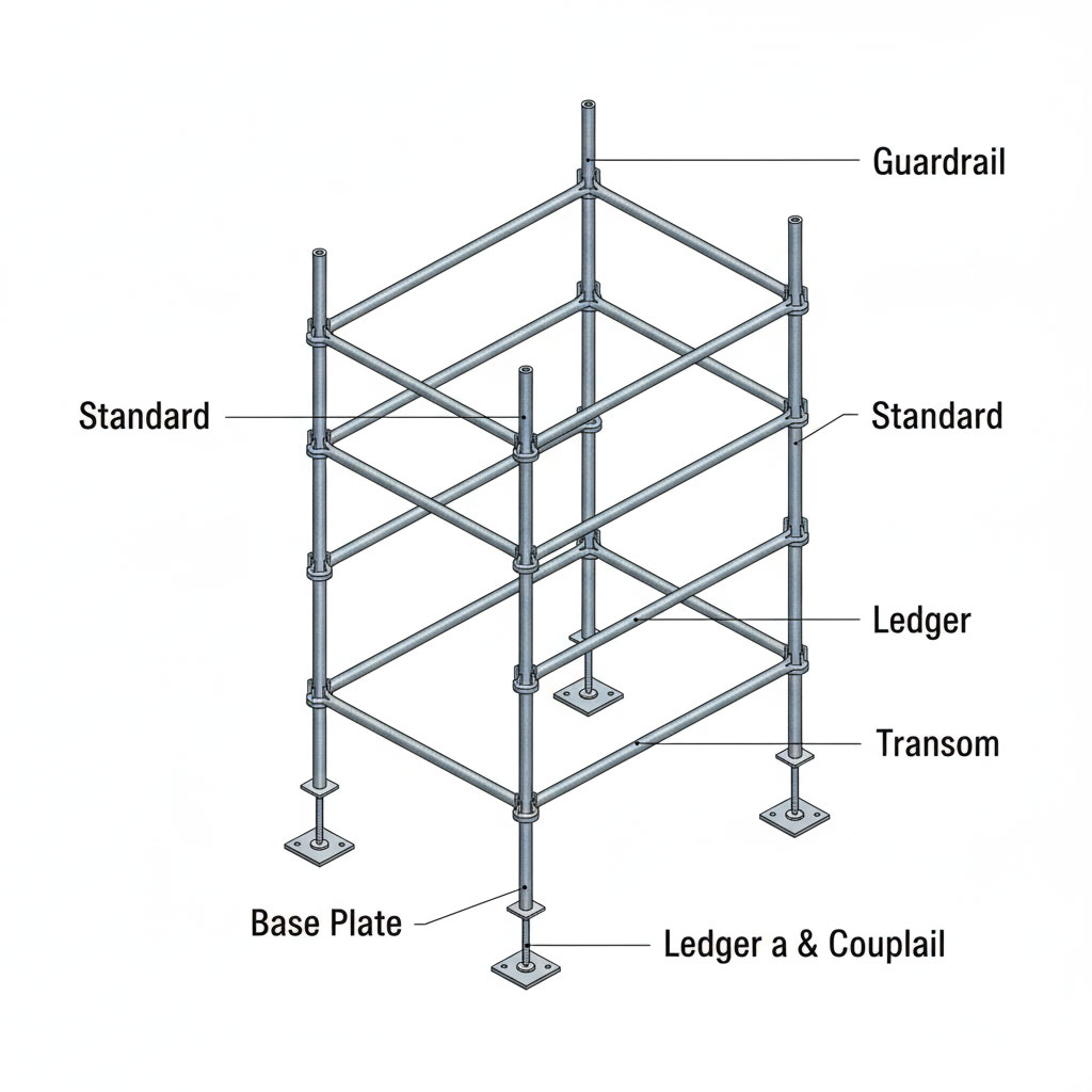 بیایید یک داربست معمولی از نوع “لوله و بست” را مثل یک پازل سه‌بعدی در نظر بگیریم و قطعاتش را یکی‌یکی بشناسیم. هر قطعه در این پازل، یک وظیفه مهم دارد.